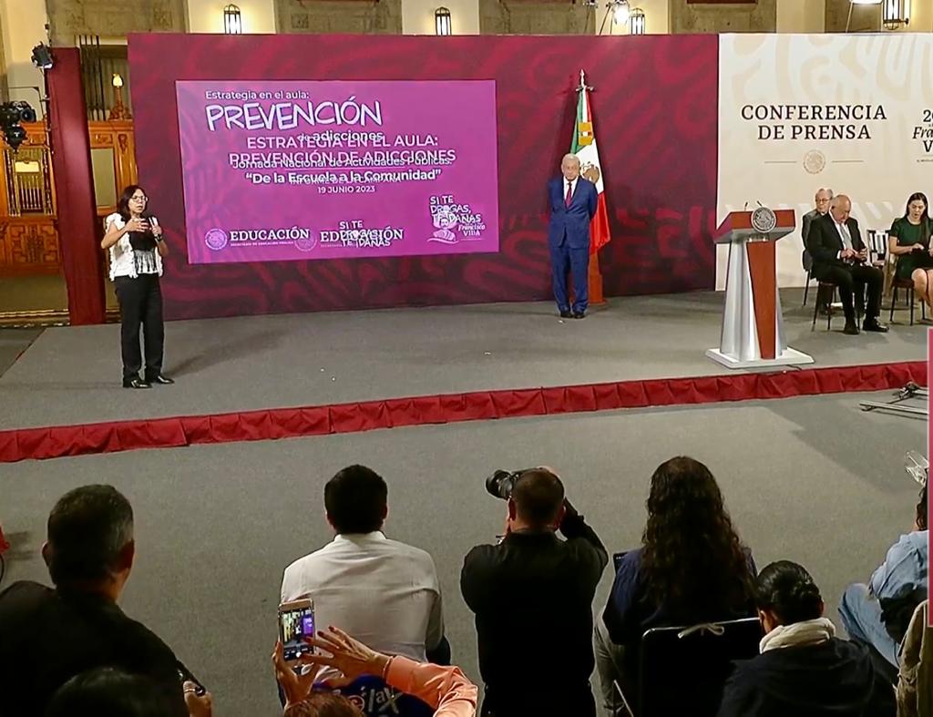 Acompañada por el secretario de Educación estatal, platicó con estudiantes sobre los contenidos de la Estrategia de Prevención de Adicciones “Si te drogas, te dañas”, y conoció algunos de sus proyectos académicos para prevenir el consumo de sustancias adictivas, como una obra teatral.